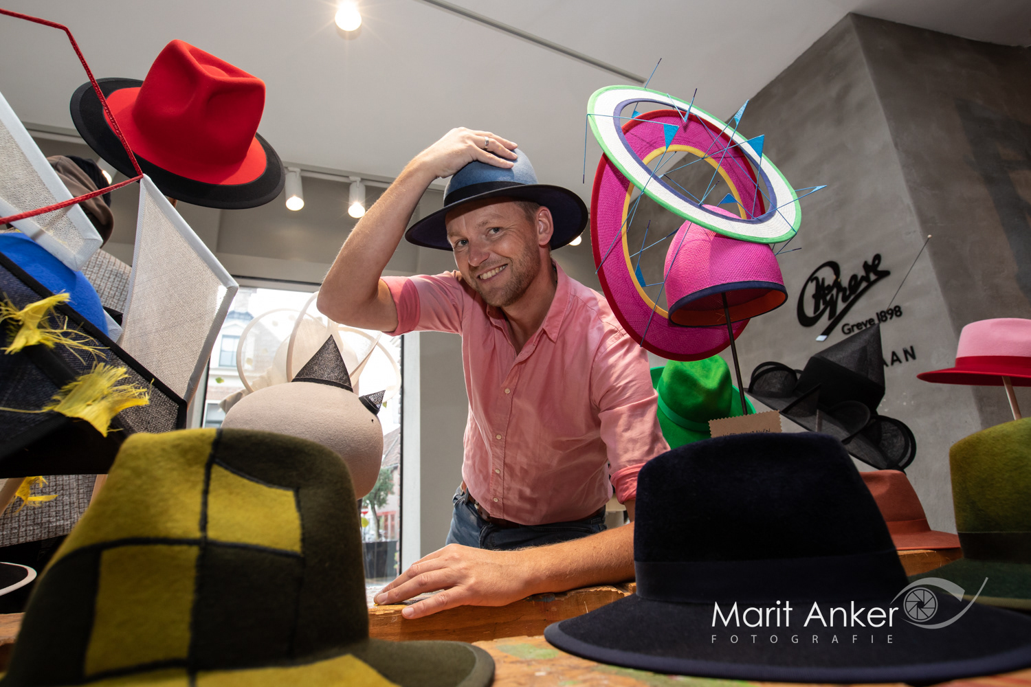 Al zijn creaties zijn stuk voor stuk unieke, handgemaakte hoeden. Van draagbare design hoeden tot kunst. Op maat gemaakt en helemaal passend bij de drager. Authentiek, inventief, perfect gemaakt en met veel gevoel voor materiaal, vorm en kleur.